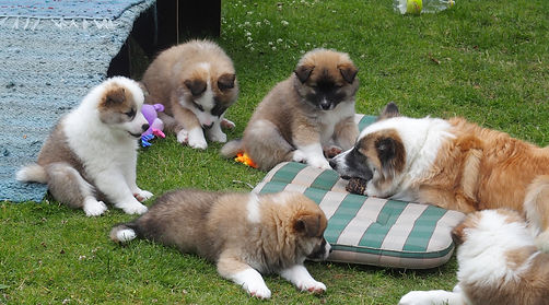 Her på siden finder du billeder af de fem søskende otte uger gamle, og hvalpene hos deres nye familier.